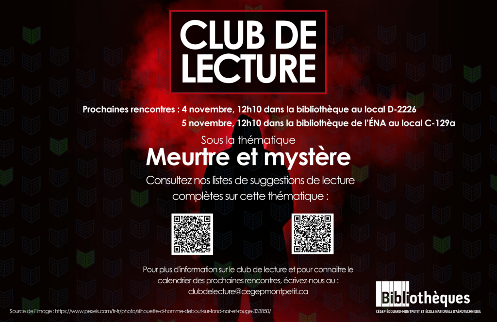 Les prochaines rencontres du club de lecture auront lieu le 4 novembre,12h10 à la bibliothèque du Cégep (local D-2226) et le 5 novembre, même heure, à celle de l’ENA (local C-129a).