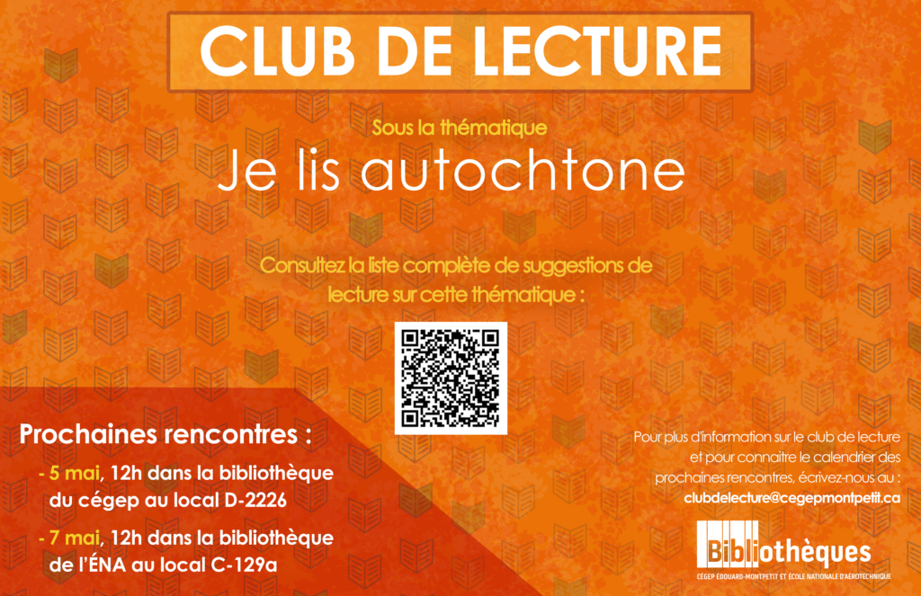 Les prochaines rencontres du club de lecture auront lieu le 5 mai, 12h à la bibliothèque du Cégep (local D-2226) et le 7 mai, même heure, à celle de l’ENA (local C-129a).